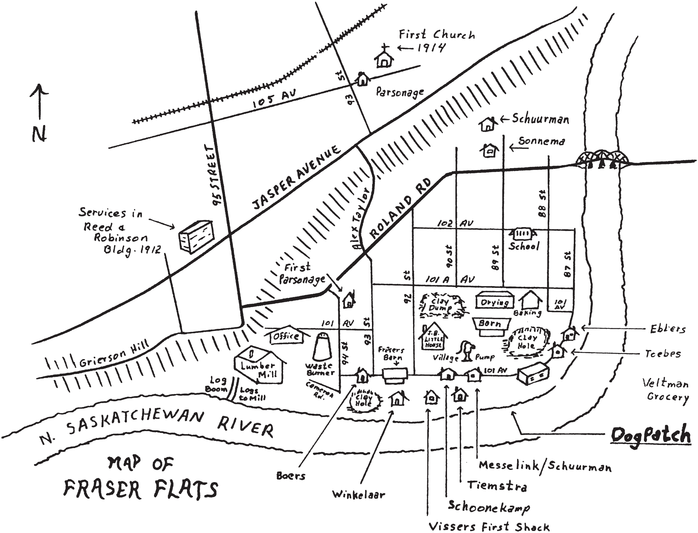 In the late 1800s, a little area in Riverdale between the JB Little Brickyard and the North Saskatchewan River sprang up. Known initially as “The Dutch Settlement”, many newcomers to Edmonton took up residence in tiny brick houses, often built from discarded bricks. This community soon became known as Dogpatch. The D. R. Fraser Lumber Mill and J. B. Little Brickyard provided employment for residents, and it was an inexpensive place for recent immigrants to live.